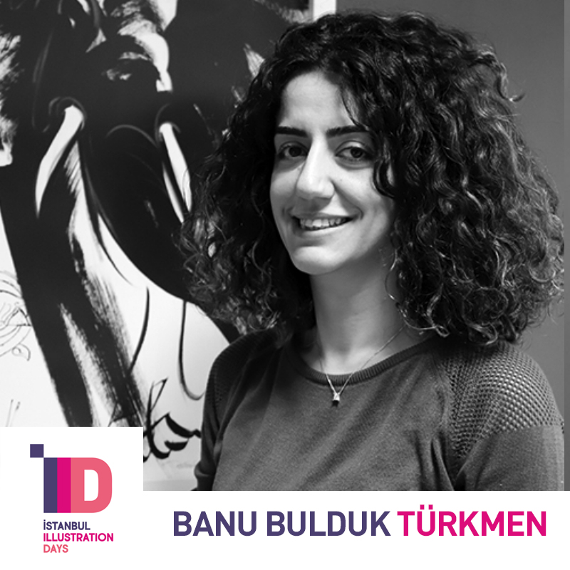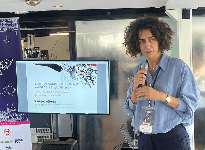 BANU BULDUK TÜRKMEN “İllüstrasyonda Lekeci Yaklaşım: Kaligrafi ile İllüstrasyon” başlıklı sunumunda, son sergisi “Cıvıltı”nın üretim sürecini arkasına teorik bir altyapıyı da koyarak adım adım anlattı. İllüstrasyonda bir fikrin oluşma, olgunlaşma ve üretim sürecinin aşamaları üzerine ufuk açıcı bir sunum yaptı.