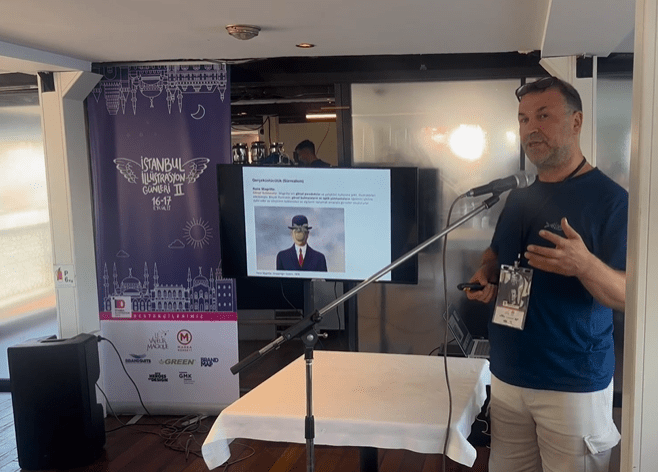 DOĞAN ARSLAN “Gerçeküstü (Sürrealist) İllüstrasyon”u ele aldığı sunumunda, René Magritte tarafından kurulan imgelerin günümüze kadar nasıl yinelendiğini, yeniden üretildiğini, resimler arasılık üzerinden anlattı.