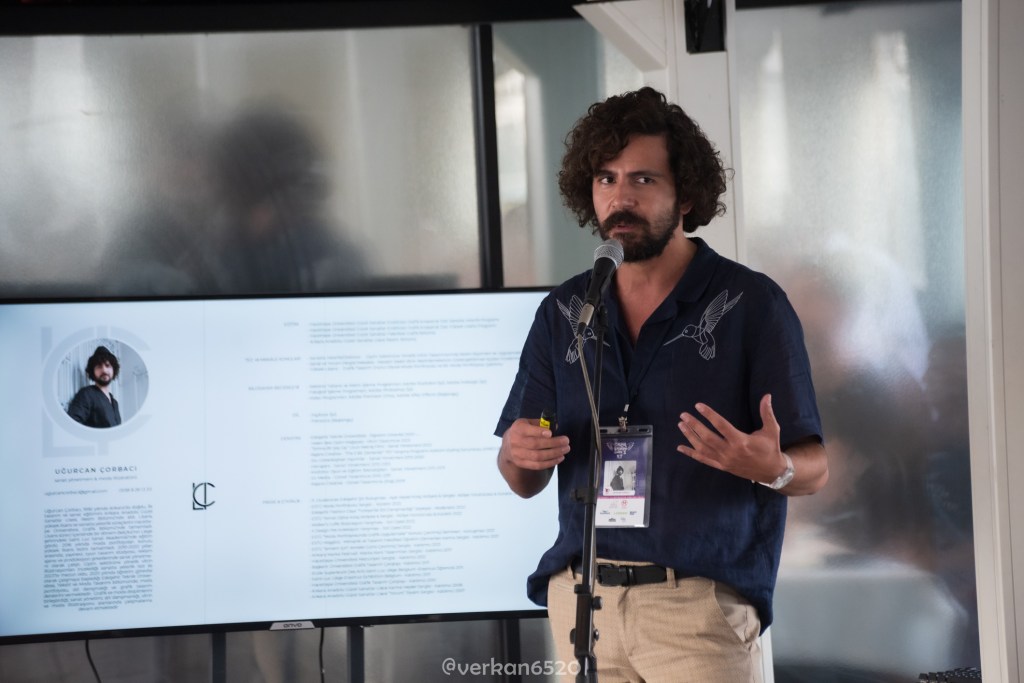 NECDET YILMAZ “Resimli çocuk kitaplarında artırılmış gerçeklik kullanımı” üzerine yaptığı sunumda kendi projesini anlattı. Etkinlik temasına uygun düşen bu anlatımda Hazerfen Ahmet Çelebi’nin Galata Kulesi’nden Üsküdar’a uçuşunu kuşlarla örnekledi. Çocuk kitaplarında artırılmış gerçeklik kullanımı örneklerini de sunan Yılmaz, projesindeki karakter tasarımı, modelleme ve animasyon adımlarını da izleyicilerle paylaştı.