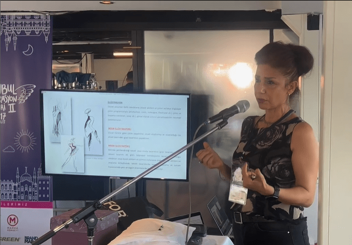 MİNE AYDOĞAN “Günümüz moda illüstrasyonlarında sıra dışı yaklaşımlar” başlıklı sunumunda illüstrasyonun önemli bir alt alanı olan moda illüstrasyonu ile ilgili bilgiler verdi. Kendi öğrencileri için uyguladığı eğitim müfredatından da bahseden Aydoğan, moda illüstrasyonunda sürdürülebilir yaklaşımlara da dikkati çekerek buluntu nesnelerle yapılan çalışmalardan örnekler verdi.