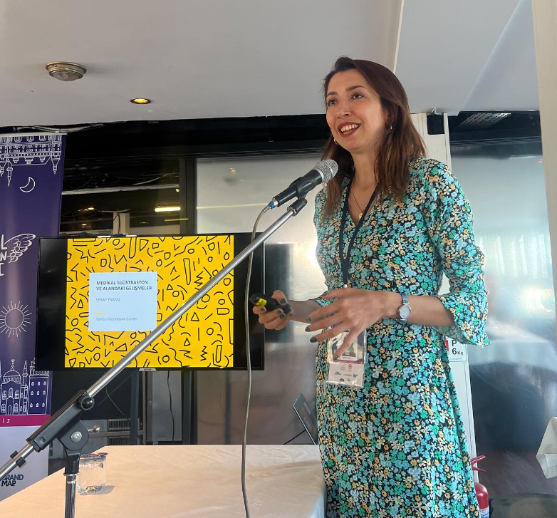 SERAP YILMAZ “Medikal İllüstrasyon ve Alandaki Gelişmeler” başlıklı sunumuyla medikal illüstrasyonun günümüzdeki durumunu anlattı. Dünyaca tanınan medikal illüstratör Levent Efe mentörlüğünde kurulan “Türk Medikal İllüstratörler Grubu” hakkında bilgi verdi.